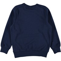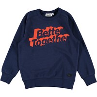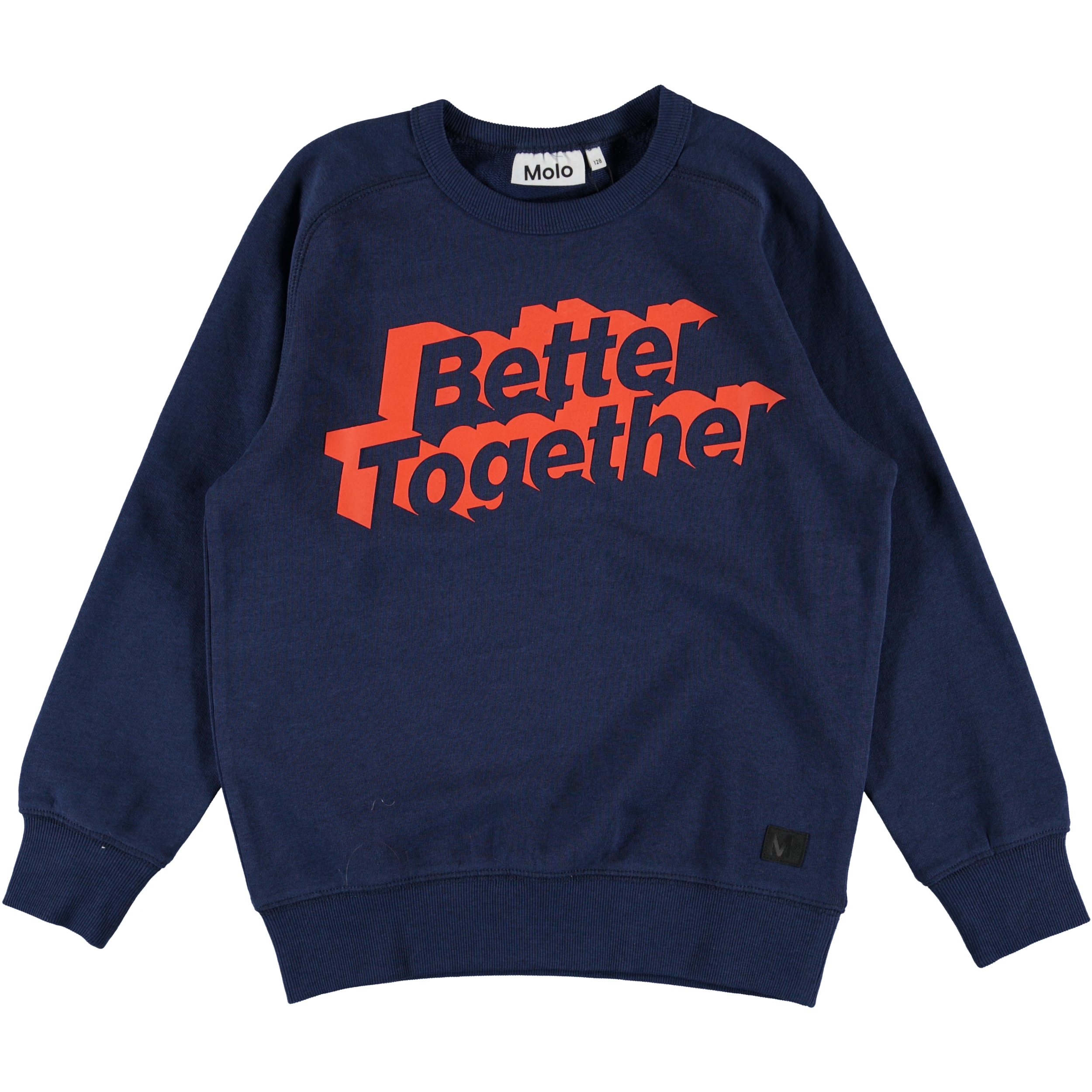 Mike is een donkerblauw trui met de tekst 'Better Together' op de voorkant in rood.