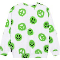 Witte sweater van 100% biologisch katoen met een groene en zwarte print. Op de print staan vele gespoten peace tekens en smileys die de boodschap 'More Love' verspreiden. De sweater heeft een normale pasvorm en heeft een ronde hals en ribboorden rond de hals, de mouwen en de onderkant.