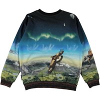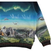 Miksi is een blauwe sweater met een print van adelaars en futuristische vliegtuigen die over kliffen vliegen. Het heeft een ronde hals en een elastische ribboord aan de onderkant en mouwen.
