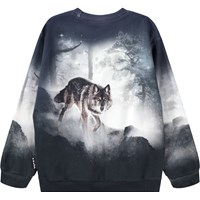 Donkerblauwe sweater gemaakt van zacht biologisch katoen met ribboorden rond de hals, mouwen en taille. De sweater heeft een ruimvallende pasvorm met een wolvenprint die helemaal rondom loopt.