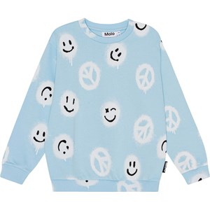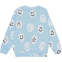 Lichtblauwe sweater van 100% biologisch katoen met een witte en zwarte print van vele gespoten peace tekens en smiley's die de boodschap 'More Love' verspreiden. De sweater heeft een normale pasvorm en heeft een ronde hals en ribboorden rond de hals, de mouwen en de onderkant. Voor een extra stoere look kun je het dragen met de bijpassende korte broek Adian die dezelfde print heeft.