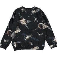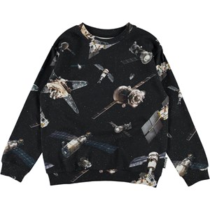 Miksi is een zwarte sweater met een print van satellieten. Het heeft een ronde hals en een elastische ribboord aan de onderkant en mouwen.