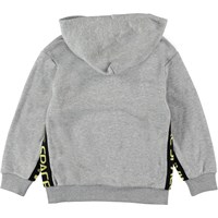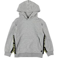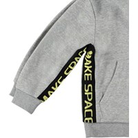 Milion is een grijze hoodie met een buidelzak aan de voorzijde en een band met de tekst 'Make Space' aan de zijkanten.