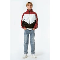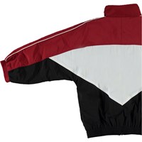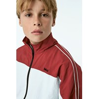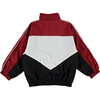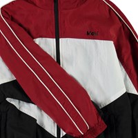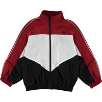 Millum is een driekleurig trainingsjack in donkerrood, zwart en wit. De jas heeft een oversized pasvorm en heeft witte biezen langs de mouwen. De jas heeft een ritssluiting aan de voorkant. Draag het met de bijpassende donkerrode trainingsbroek.