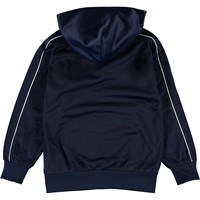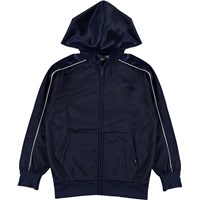 Mizzo is een donkerblauwe hoodie met een ritssluiting en witte biesjes. Draag Mizzo met bijpassende broek voor een coole en sportieve look.