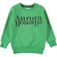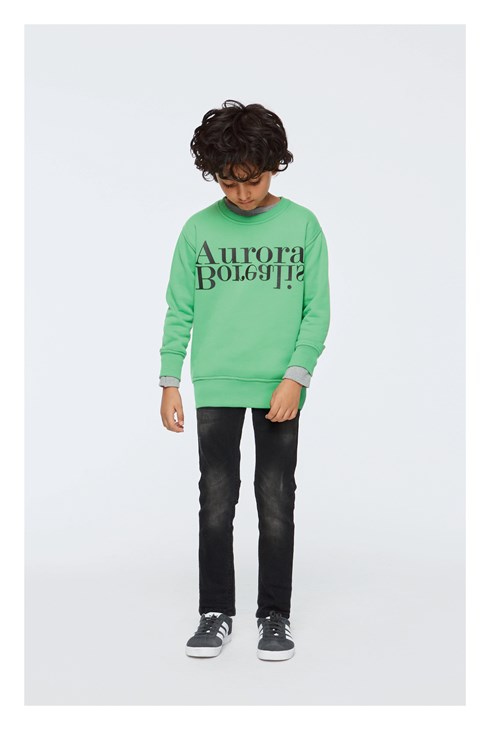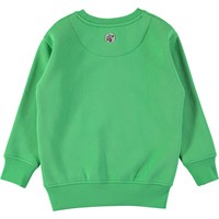 Groene trui met zwarte applique letters aan de voorzijde. De trui heeft een zachte binnenzijde en ribboord aan de hals, mouwen en onderkant.