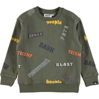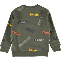 Groen sweatshirt met grafische tekst in verschillende vormen, zoals bijvoorbeeld rubber, print en patches. Het heeft een zachte, binnenzijde en ribboord aan de hals, mouwen en onderkant.