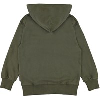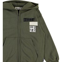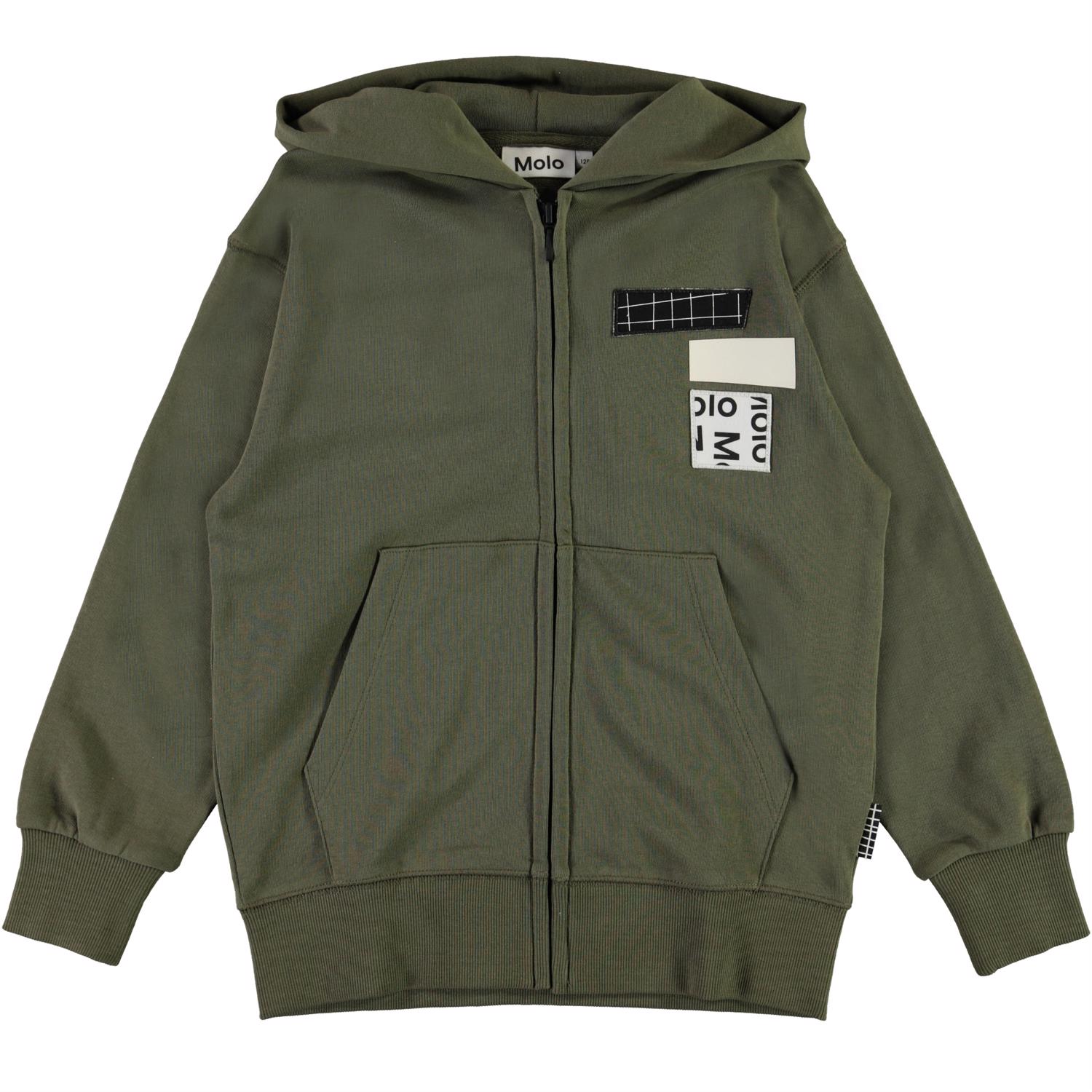 Mok is een kakigroene sweater met ritssluiting, capuchon en verschillende Molo patches op de borst.