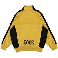Monrad is een mosterdgele trainingsjas met zwarte details aan de zijkanten en 2003 gedrukt op de voor- en achterkant. De jas heeft een hoge kraag, een ritssluiting en elastische ribboorden aan de onderkant en de mouwen. Draag de jas met een bijpassende broek voor een stoere en sportieve look.