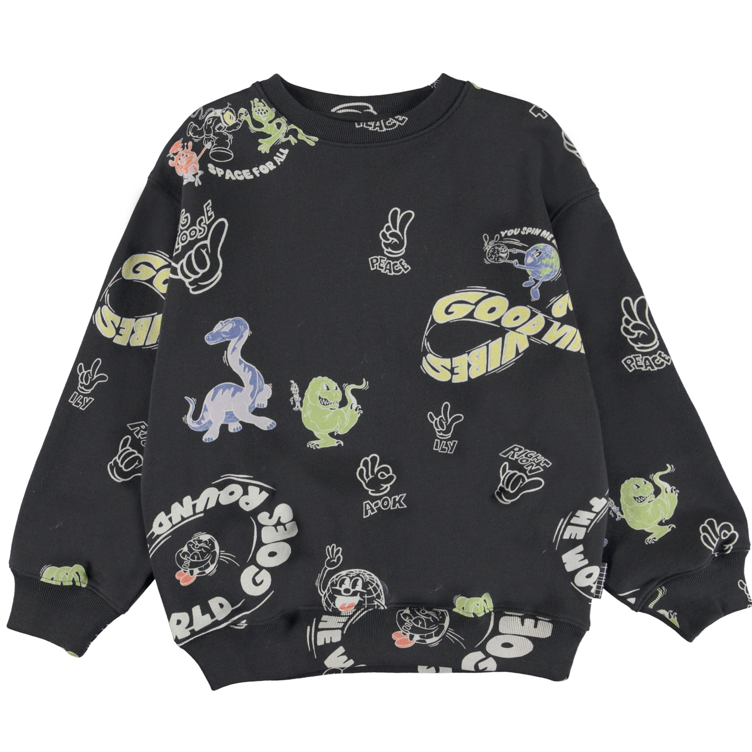 Monti is een zwarte sweater met verschillende printen van tekst en handgebaren.