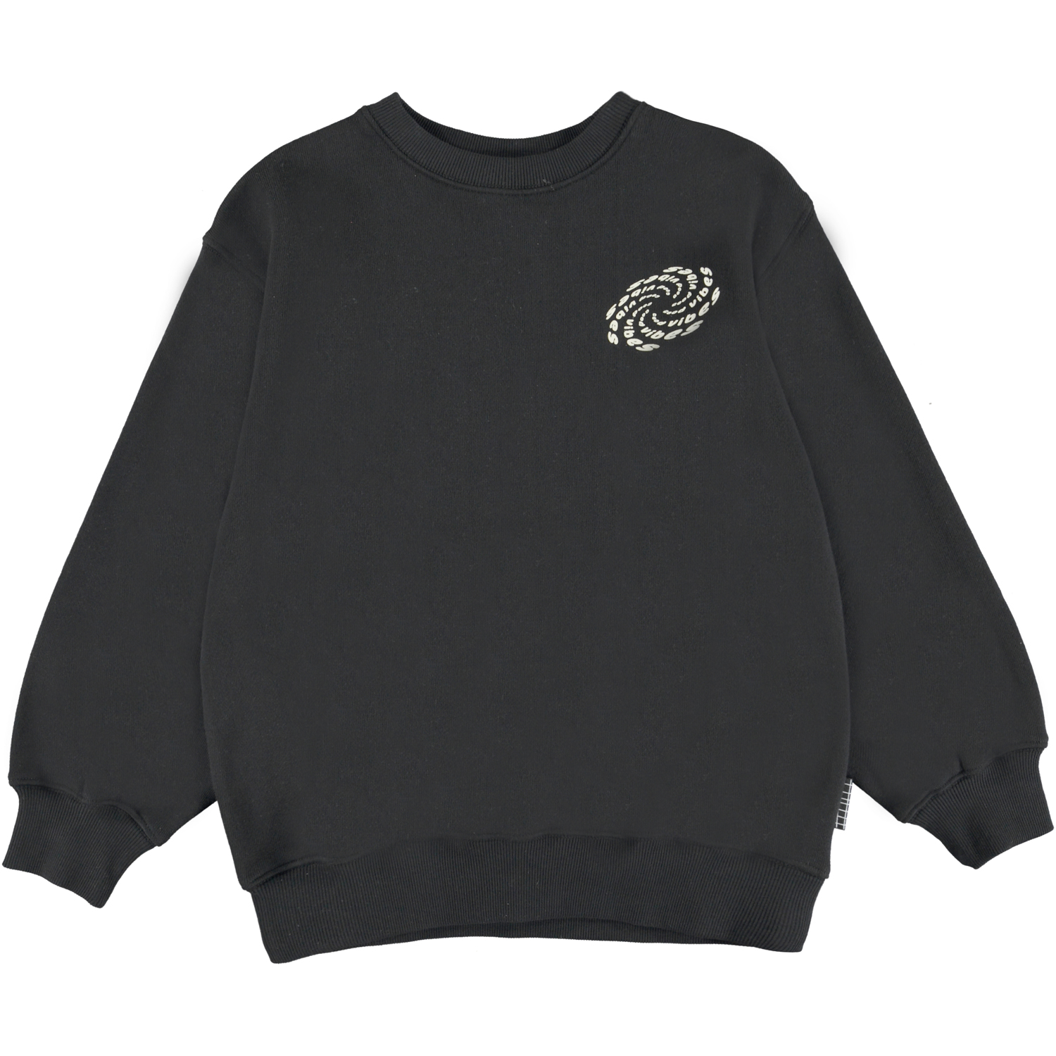 Monti is een zwarte sweater met de tekst ‘ Good vibes’, die een grote spiraal vormt op de achterkant en een kleinere op de linkerborst.