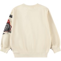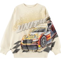 Beige sweater gemaakt van zacht, biologisch katoen met ribboorden rond de hals, mouwen en onderkant. De sweater heeft een ruime en relaxte pasvorm met een print van een raceauto bij de finishlijn en de tekst 'Unity'.