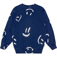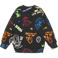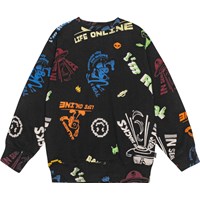 Zwarte sweater gemaakt van biologisch katoen met een gevoerde binnenkant, waardoor het zacht en warm is om te dragen. De sweater heeft een ruime pasvorm, lange mouwen, een ronde hals met geribbelde boord, en een all-over print met verschillende gekleurde stripfiguren, zoals een alien die op zoek is naar snacks en bananen naar zijn UFO straalt, een kat met een computerscherm als hoofd, kijkend naar een computermuis, en een alien die een VR-headset draagt. Een levendig patroon met veel leuke details.