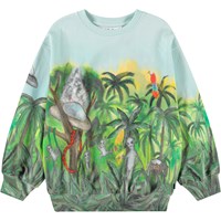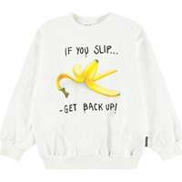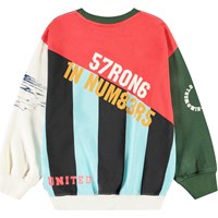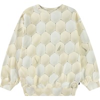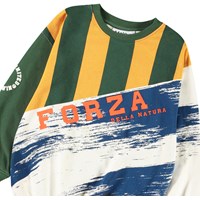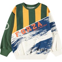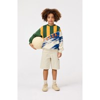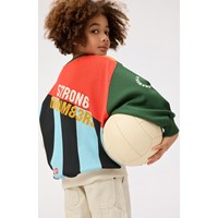 Kleurrijke sweater van zacht biologisch katoen met ribboord rond de hals, mouwen en onderkant. De sweater heeft een ruimvallende pasvorm en een stoere print geïnspireerd op de voetbalwereld.
