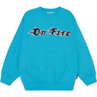 Monti is een turquoise sweater van 100% katoen met op de voorkant een zwart/wit geborduurde tekst. De kleur van de heetste vlam is wit, niet rood, en het 'On Fire' is in vlammende letters in zwart en wit op de borst geborduurd. Monti heeft een ronde hals en ribboord rond de hals, de mouwen en de onderkant. Het heeft een ruimvallende pasvorm.