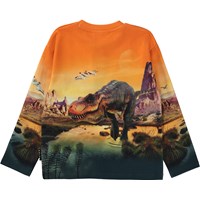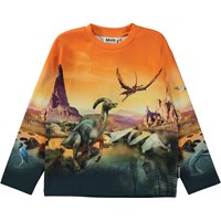 Oranje sweater met print van dinosaurussen. De print laat een ruimteschip zien dat een noodlanding heeft gemaakt op een verre planeet waar verschillende dinosaurussen rondzwerven onder een oranje hemel. Maar de scène lijkt een beetje te bekend. Misschien is het geen verre planeet. Zou het kunnen dat we net terug in de tijd zijn gereisd op onze eigen planeet? Deze sweater is gemaakt van 100% katoen, heeft een ronde hals met een ribboord en heeft een normale pasvorm.
