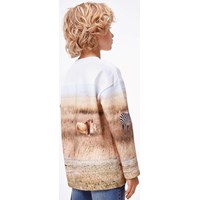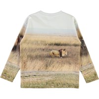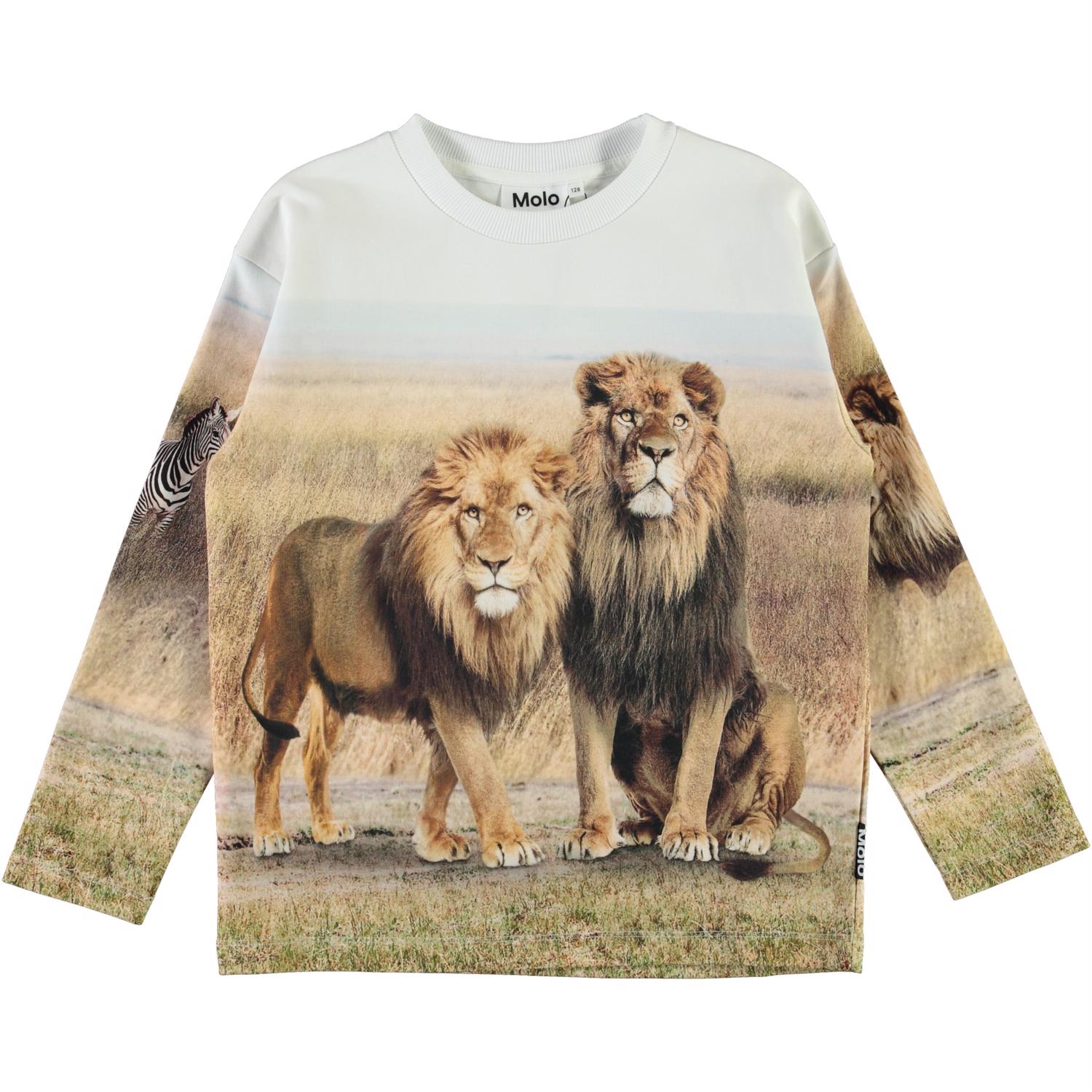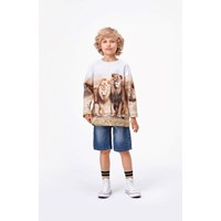 Mountoo is een shirt waarvan de print je meeneemt op een reis naar de savanne, de thuisbasis van de leeuwen. Op de voorkant van het shirt zijn drie grote leeuwen verzameld. Het heeft een ronde hals en elastische ribboorden aan de mouwen en onderkant.