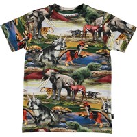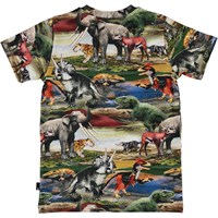 Raphie is een t-shirt met een print van een prehistorische wereld met dieren in prachtige groene en rode kleuren.