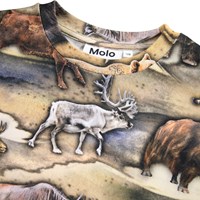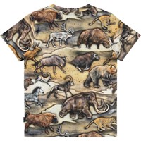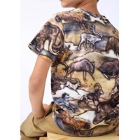 T-shirt gemaakt van zacht biologisch katoen met een ribboord rond de hals. Het t-shirt is slim fit en heeft een print van rennende dieren op de savanne in gouden en bruine tinten.
