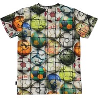 Raphie is een t-shirt met een print van kleurrijke voetballen achter een net.