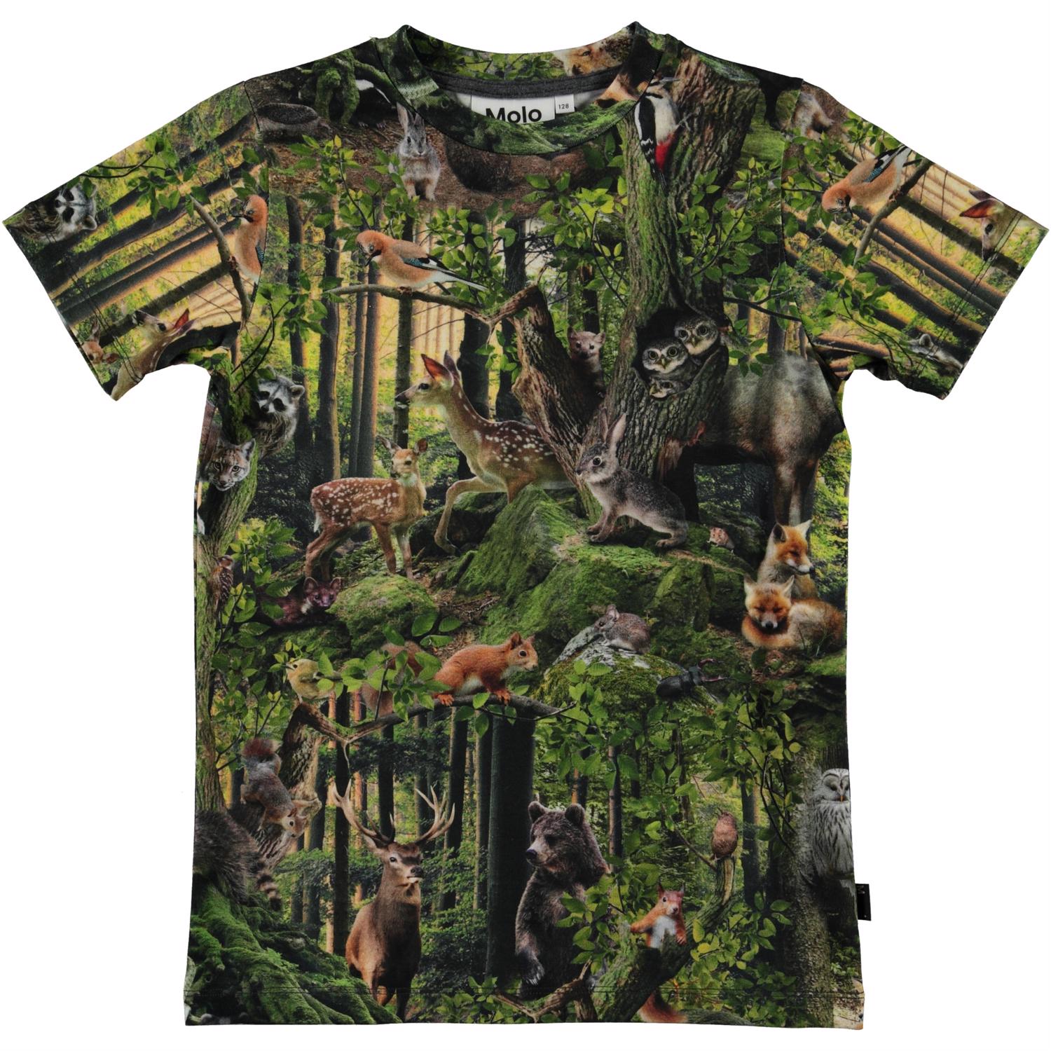 Ralphie is een t-shirt met een bosprint. Probeer in de print alle verschillende dieren van het bos te spotten. Het t-shirt heeft een ronde hals.