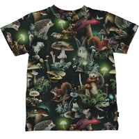 Zwart t-shirt met een print. De print legt een rustig en gezellig moment in de schemering van het bos vast, waar kleine knaagdieren en andere kleine diertjes tussen de paddenstoelen rondlopen, verlicht door lichtgevende paddenstoelen. De lichtgevende paddenstoelen werken als kleine lampjes op de bodem van het donkere bos. Dit t-shirt is gemaakt van 100% katoen, heeft korte mouwen, een ronde hals met rib en een normale pasvorm.
