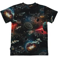 Donker gekleurd t-shirt met een print. Het heeft een heelalprint in een retro stijl. In het heelal, met zijn heldere, wilde kleuren, is er, overal waar je kijkt, plezier. We volgen avontuurlijke ruimteschepen en UFO's die op zoek zijn naar spektakel in de asteroïdengordel. Dit t-shirt is gemaakt van 100% katoen, heeft korte mouwen, een ronde hals met rib en een normale pasvorm.