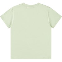 Lichtgroen t-shirt van zacht biologisch katoen met ribboord rond de hals. Het t-shirt heeft een ruimvallende pasvorm met op de voorkant een print van kleurrijke surfplanken op een prachtige zandstrand.