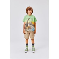 Rame, in de print ‘Colourful Dinos’ is een t-shirt van biologisch katoen met op de voorkant een print van een dinosaurus. De hemel boven de dinosaurus en de achterkant van het t-shirt heeft een sterke groene kleur.