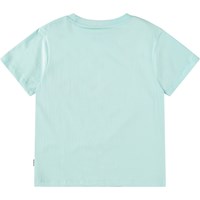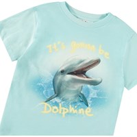 Lichtblauw t-shirt van zacht biologisch katoen met ribboord rond de hals. Het t-shirt heeft een ruimvallende pasvorm met op de voorkant een print van een blije dolfijn met de tekst "It's gonna be Dolphin".