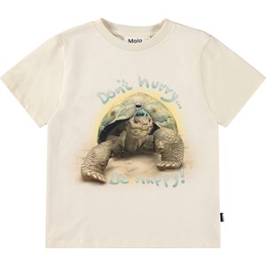 Gebroken wit t-shirt van zacht biologisch katoen met ribboord rond de hals. Het t-shirt heeft een ruimvallende pasvorm met op de voorkant een print van een schildpad en hagedis met de tekst "Don't hurry...Be Happy".
