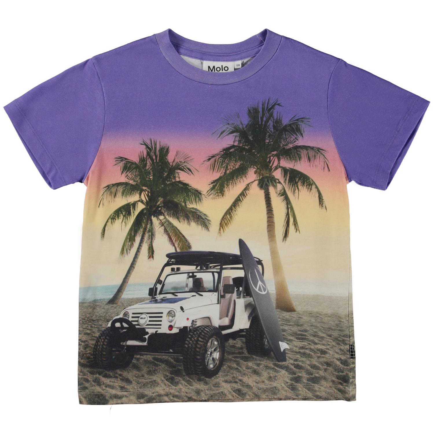 Rame is een t-shirt van biologisch katoen met een print van een zonsondergang over het strand met palmbomen, een paarse jeep en een surfplank.