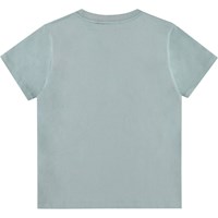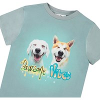 Blauw t-shirt van zacht biologisch katoen met ribboord rond de hals. Het t-shirt heeft een ruimvallende pasvorm met op de voorkant een print van twee lachende honden en de tekst "Pawsome Vibes".