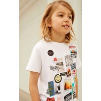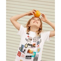 Rame is een wit t-shirt met een print van verschillende sticker van voormalige Molo printen. Het t-shirt heeft een ronde hals en korte mouwen.