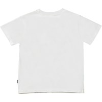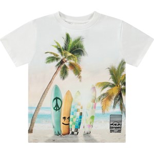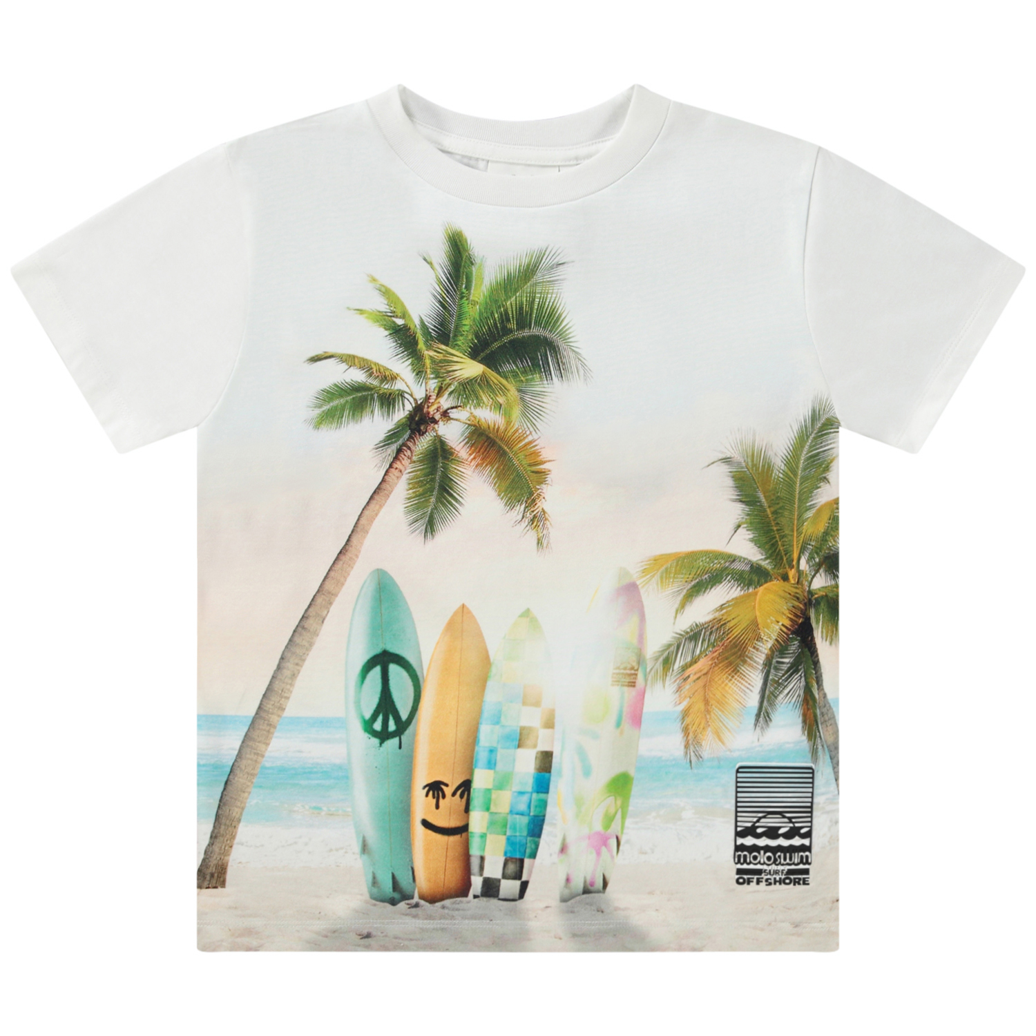Wit t-shirt met op de voorkant een print. Het t-shirt is van 100% biologisch katoen met een print van palmbomen en surfplanken op een tropisch strand. Het t-shirt heeft een ronde hals met ribboord en een normale pasvorm.