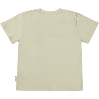 Rame is een zandkleurig t-shirt met op de voorkant een print van surfplanken. De surfplanken staan in het zand met de schuimende oceaan op de achtergrond.