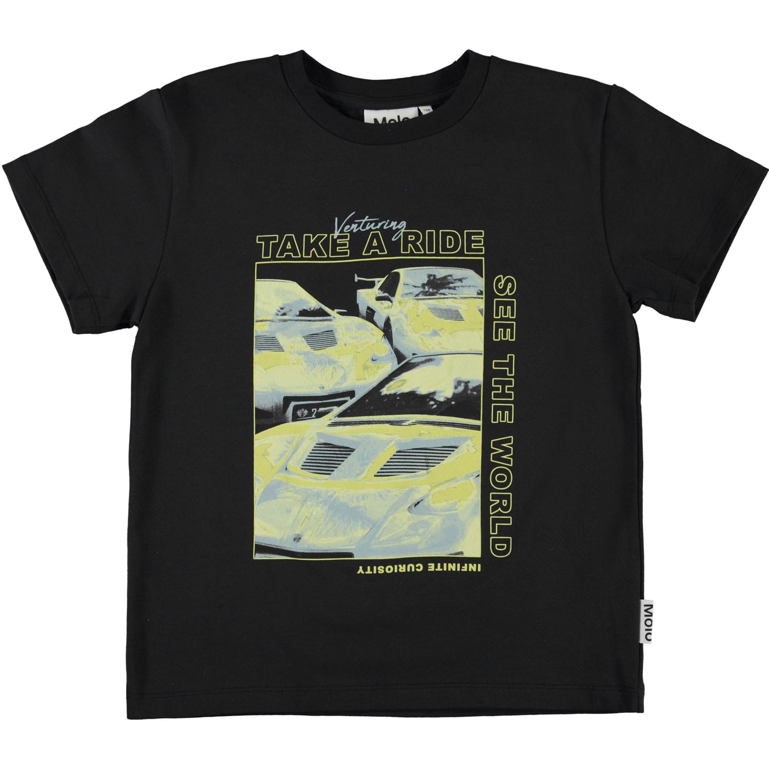 Rame is een zwart t-shirt met op de voorkant een print van sportauto’s en de tekst ‘Take a ride, see the world’.