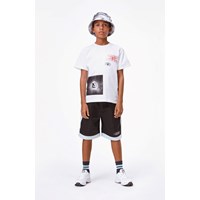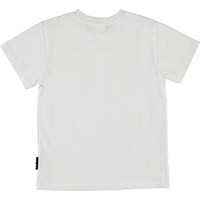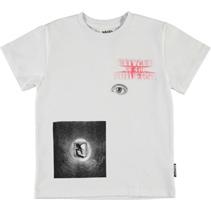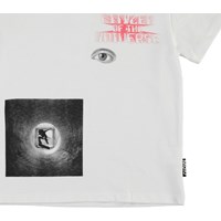 Rame is een wit t-shirt met een print van een skater, een oog en de tekst ‘Citizen of the universe’.