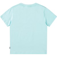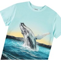Lichtblauw t-shirt van zacht biologisch katoen met ribboord rond de hals. Het t-shirt heeft een ruimvallende pasvorm met op de voorkant een print van een blauwe vinvis die in de uitgestrekte open zee springt.