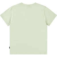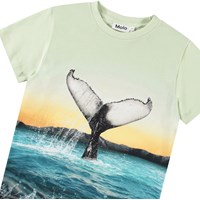 Lichtgroen t-shirt van zacht biologisch katoen met ribboord rond de hals. Het t-shirt heeft een ruimvallende pasvorm met op de voorkant een print van de staart van een blauwe vinvis in de uitgestrekte open zee.