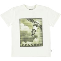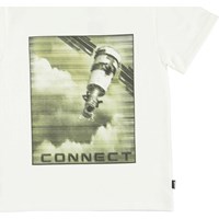 Rame is een witte t-shirt met een print van een opstijgend ruimteschip.