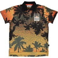 Ramon is een oranje met groen polo t-shirt met een print van palmbomen en een grafische zonsondergang. Het t-shirt heeft een zwarte kraag en knoopsluiting. Het is van 100% katoen.
