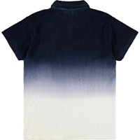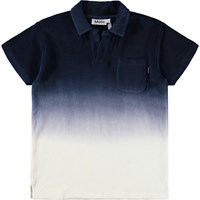 Blauw-wit poloshirt van biologisch katoenen badstof met korte mouwen en een kraag. Het T-shirt heeft een losse pasvorm, een borstzak en zijsplitten.