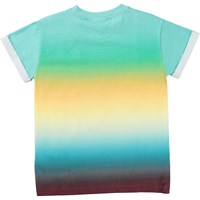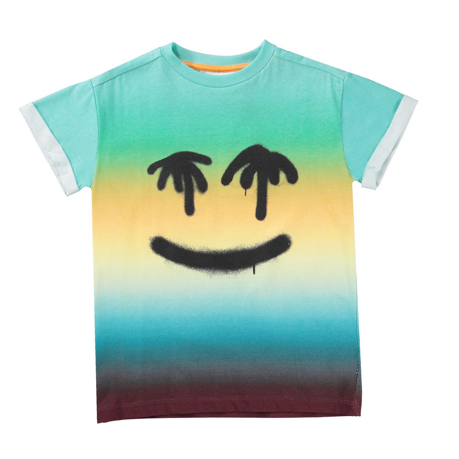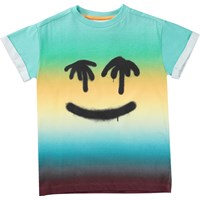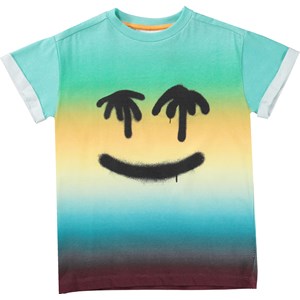 T-shirt van 100% biologisch katoen in blauw- en geeltinten met een print op de voorkant. Het is een zwart graffiti emoji met ogen van palmbomen op een achtergrond van vage kleuren. Het t-shirt heeft korte mouwen met omslag en het heeft een normale pasvorm.