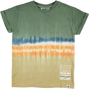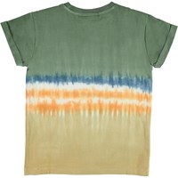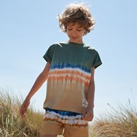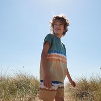 Randon is een tie-dye t-shirt in zand, oranje, blauw en groen met opgerolde mouwen. Het t-shirt is van 100% katoen.