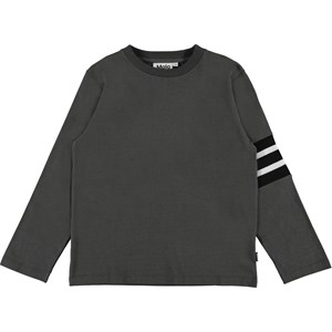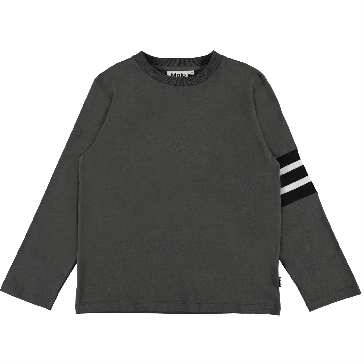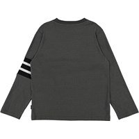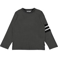 Ras is een bruine shirt met lange mouwen en witte en zwarte strepen op één mouw.
