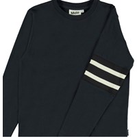 Ras is een blauw shirt met lange mouwen en strepen op één mouw.