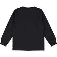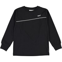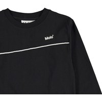 Rasmono is Molo's nieuwe, must-have basic trui met lange mouwen. De trui is zwart, heeft een ronde hals, een logo en een asymmetrische streep aan de voorzijde.