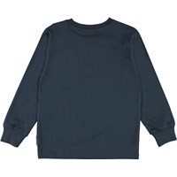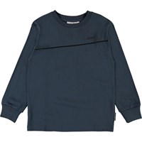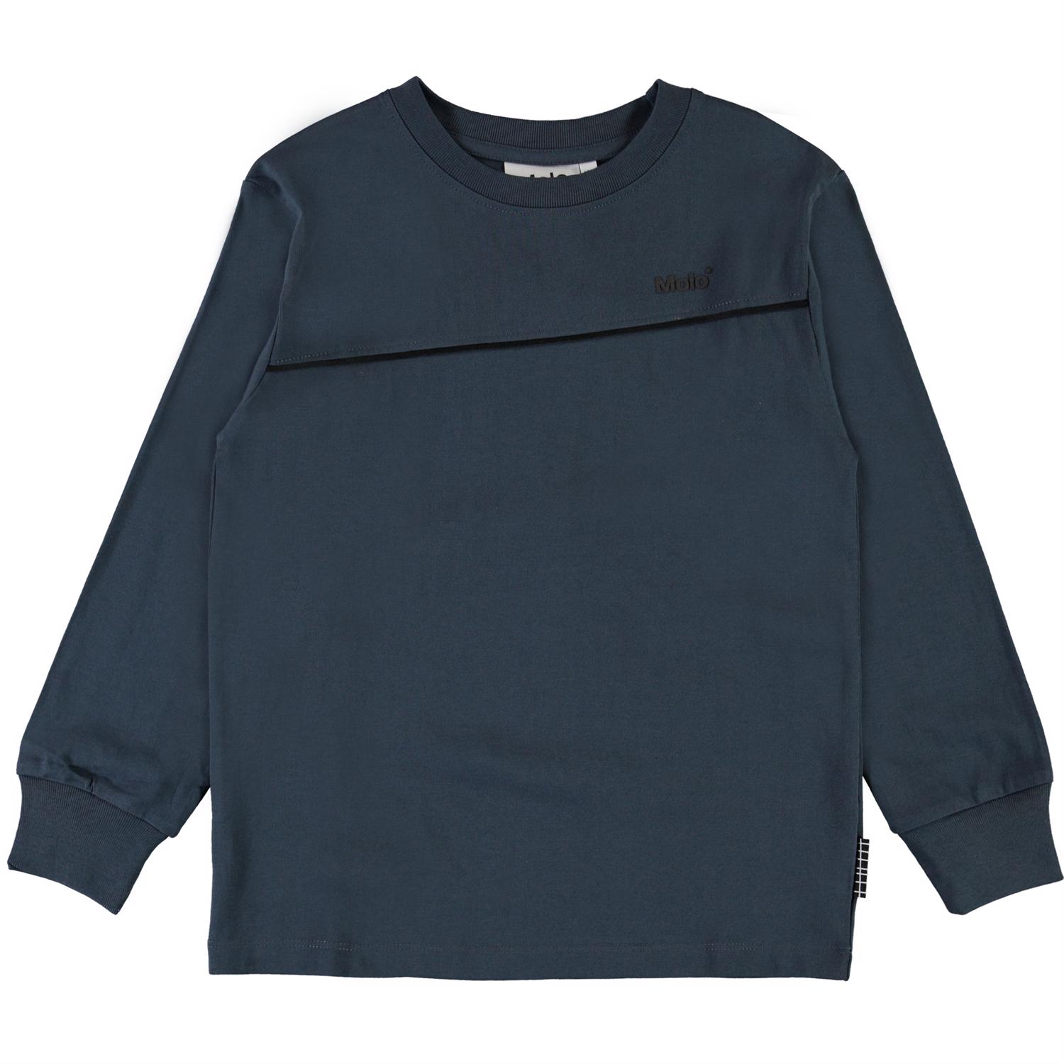 Rasmono is een blauw shirt met lange mouwen en zwarte schuine biezen over de borst en met een Molo-logo.