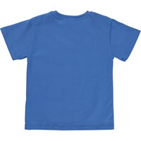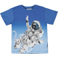 Rasmus is een blauw t-shirt met een print van een astronaut.